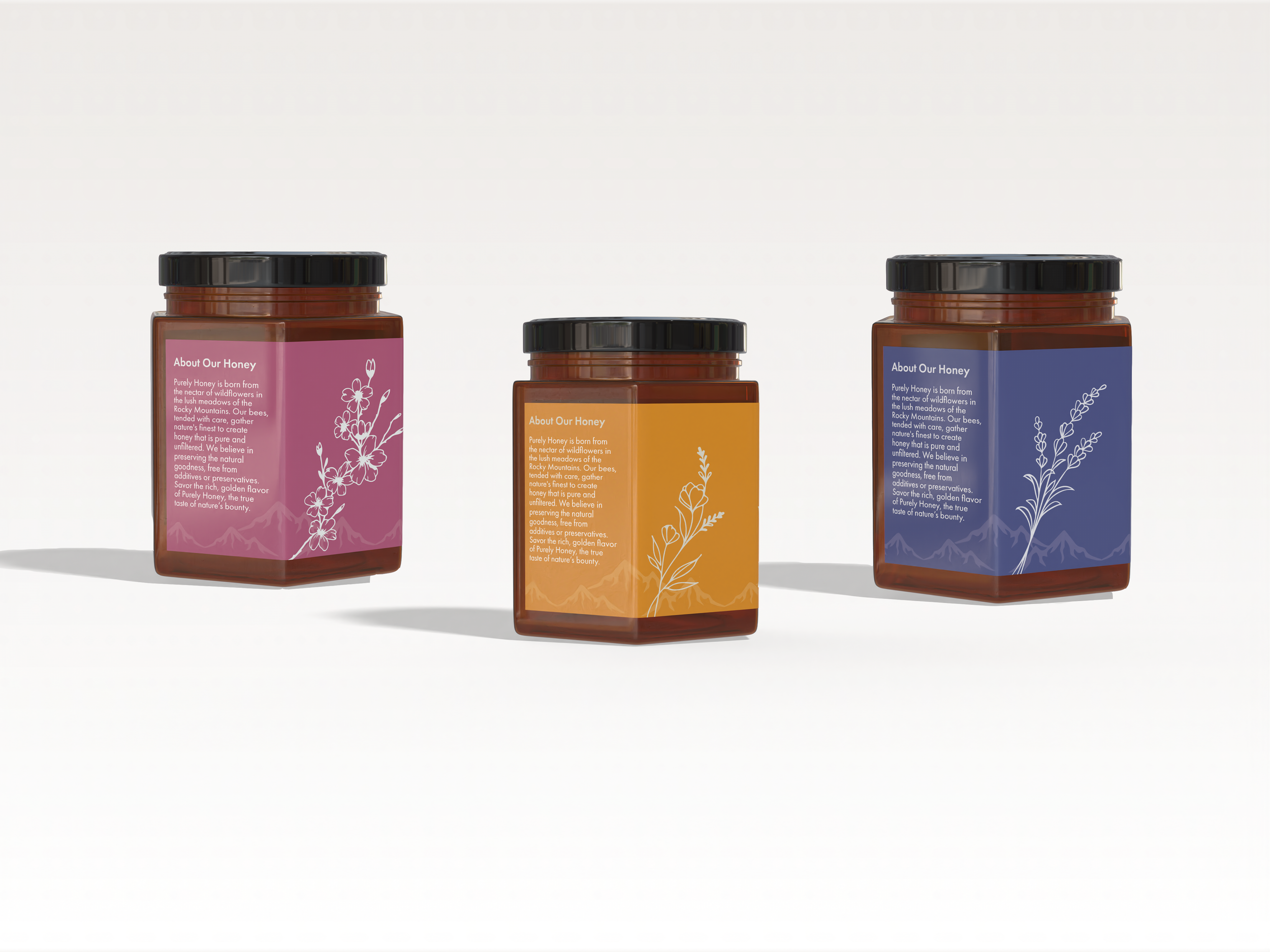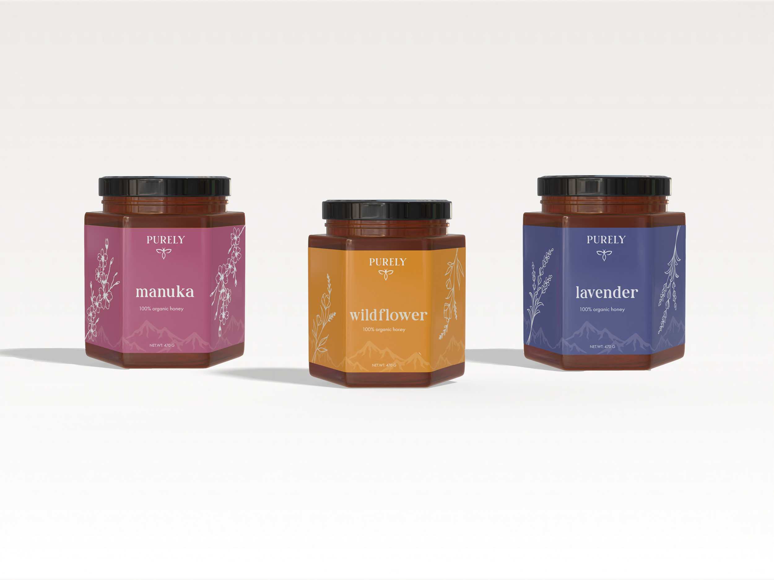 Purely Honey is crafted from nature’s finest, offering a pure and unfiltered honey experience. This project involves designing elegant, visually appealing packaging for three unique flavors, aimed at consumers who appreciate stylish, high-quality products. The packaging should reflect the natural essence and purity of the honey while maintaining a cohesive, sophisticated look across the flavor range.